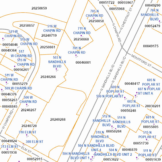 All the information contained on this media is prepared for the inventory of real property found within Moore. All data is compiled from recorded deeds, plats, and other public records and data. Users of this data are hereby notified that the aforementioned public primary information sources should be consulted for verification of the information. information contained herein was created for the County’s internal use. MOORE COUNTY, ITS OFFICIALS, AGENTS AND EMPLOYEES MAKE NO WARRANTY AS TO THE CORRECTNESS OR ACCURACY OF THE INFORMATION SET FORTH ON THIS MEDIA WHETHER EXPRESS OR IMPLIED, IN FACT OR IN LAW, INCLUDING WITHOUT LIMITATION THE IMPLIED WARRANTIES OF MERCHANTABILITY AND FITNESS FOR A PARTICULAR USE.Any resale of this data is strictly prohibited in accordance with North Carolina General Statutes 132-10. Grid is based on North Carolina State Plane Coordinate System NAD83 (feet).